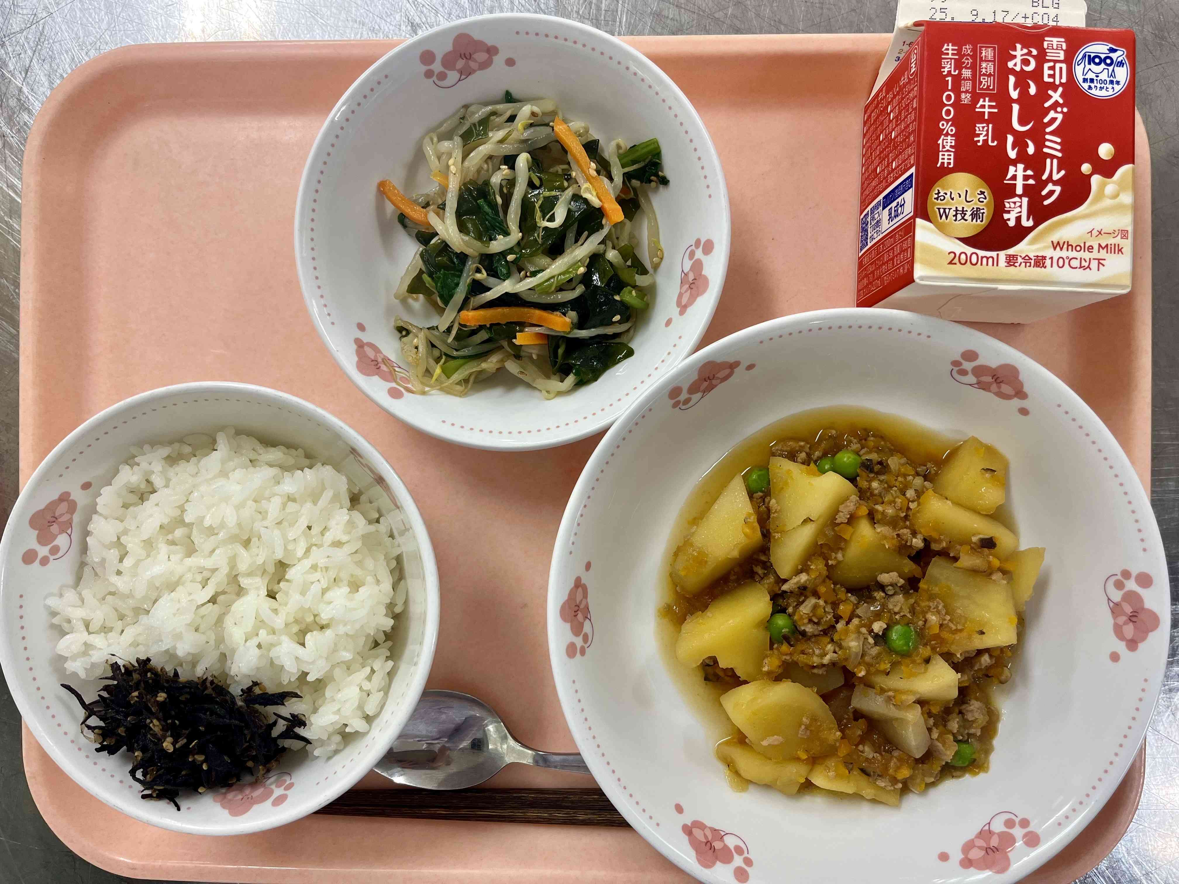 ○牛乳 ○ごはん ○ひじきふりかけ ○じゃがいものそぼろ煮 ○もやしとわかめのごま醤油
