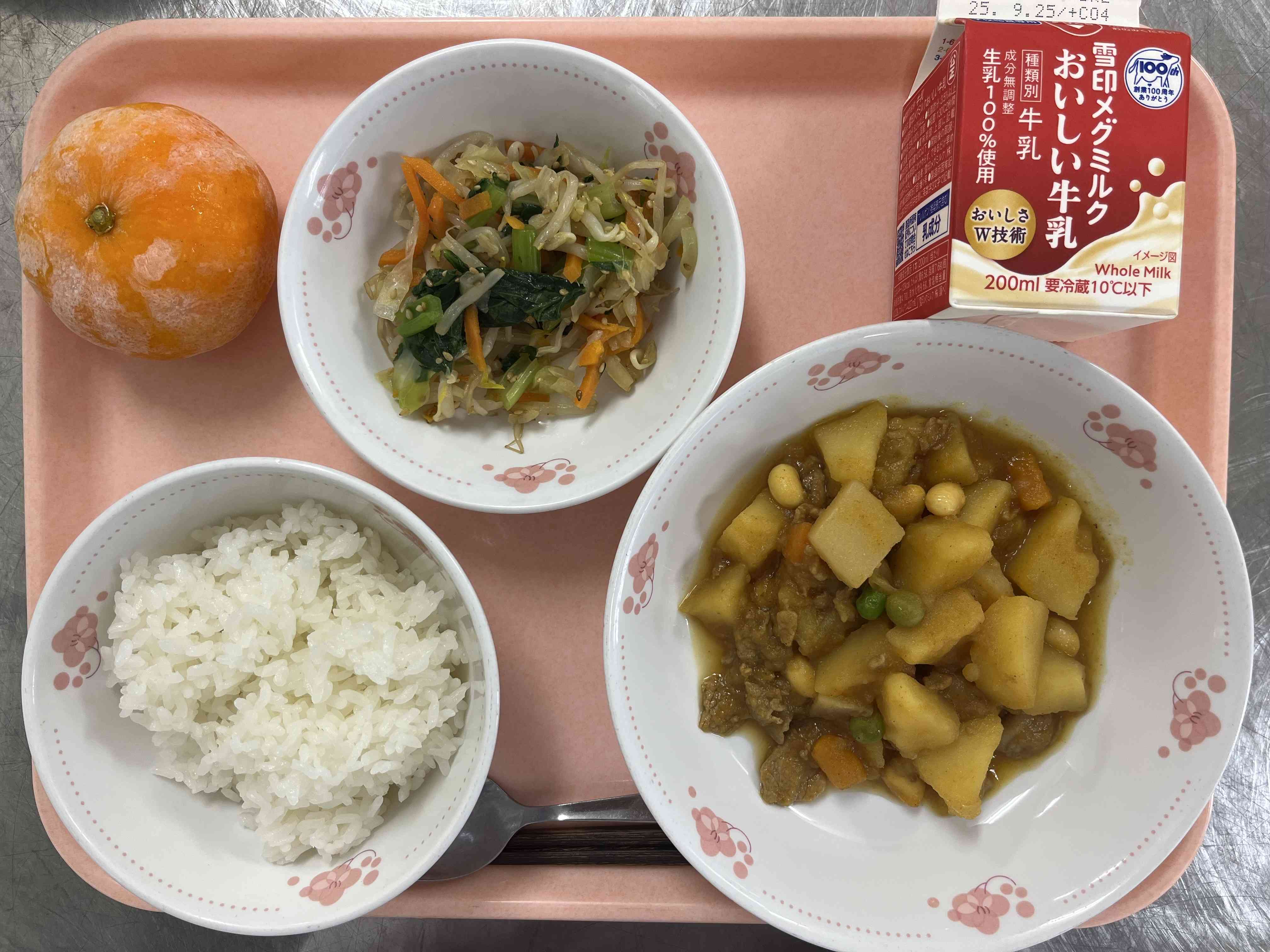 ○牛乳 ○ごはん ○カレー肉じゃが ○小松菜の和え物 ○冷凍みかん