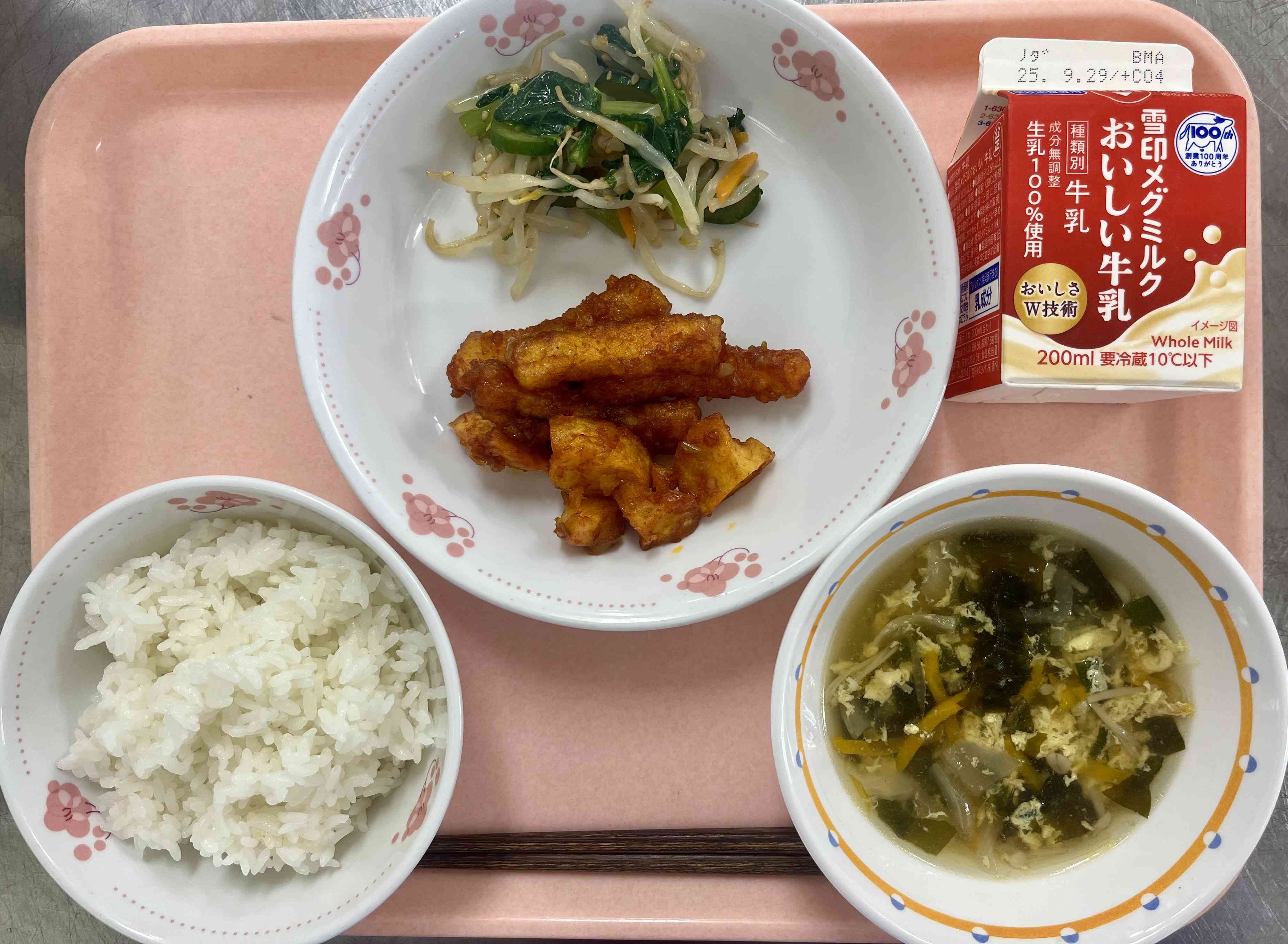 ○牛乳 ○ごはん ○いかとじゃがいものチリソース ○ゆで野菜中華ドレッシング ○卵入りわかめスープ