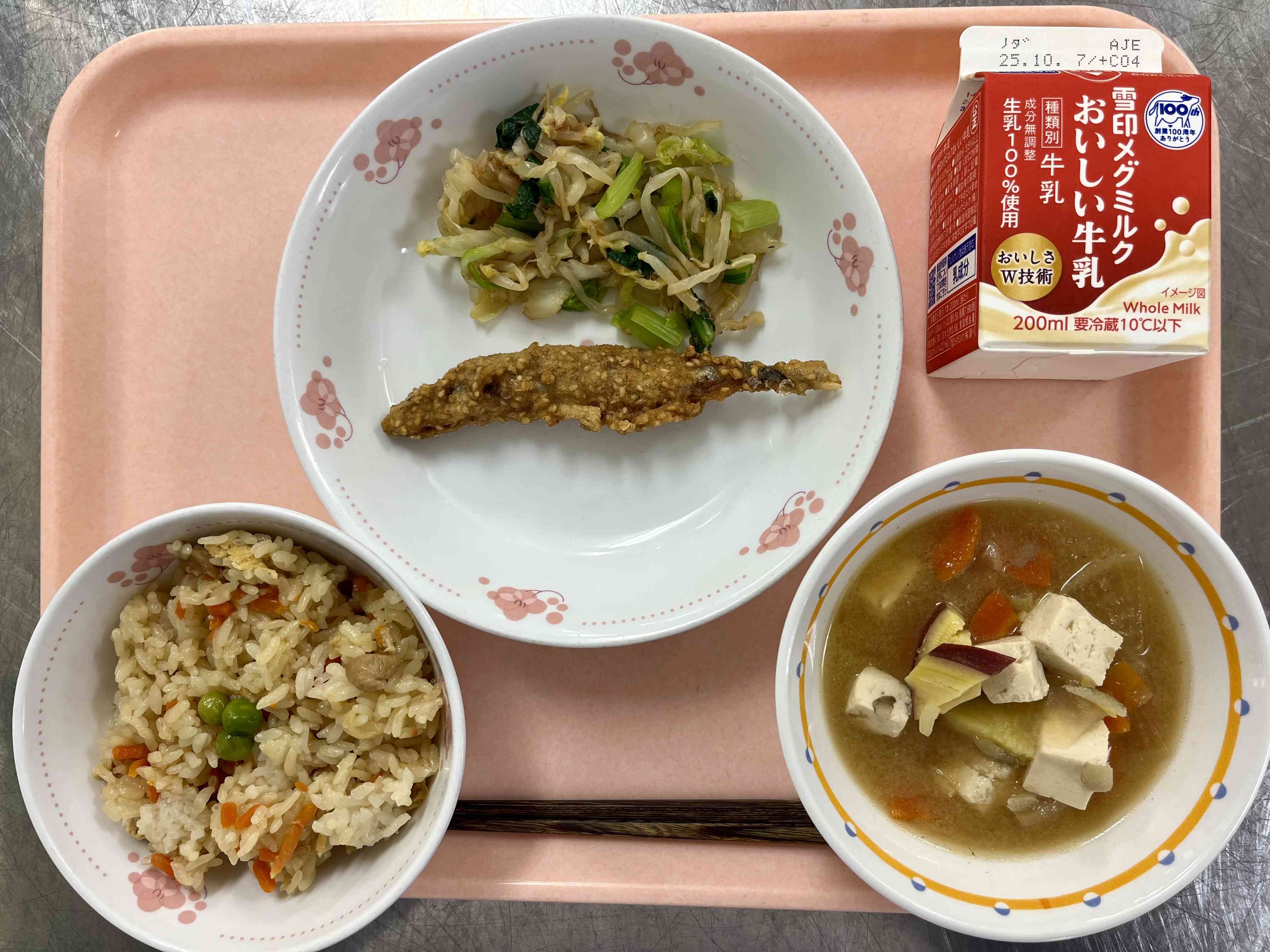 ○牛乳 ○切り干し大根ごはん ○ししゃものごま天ぷら ○ゆで野菜とさ醤油 ○さつま汁