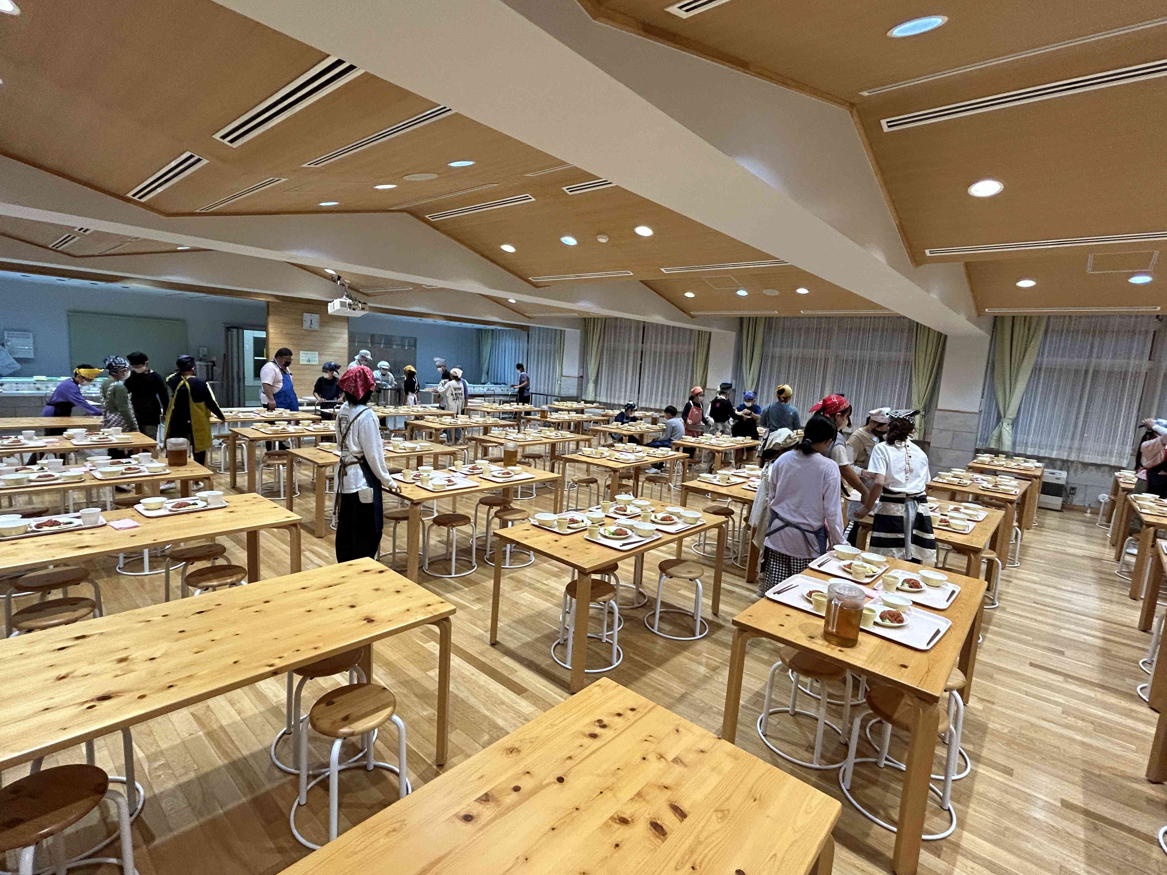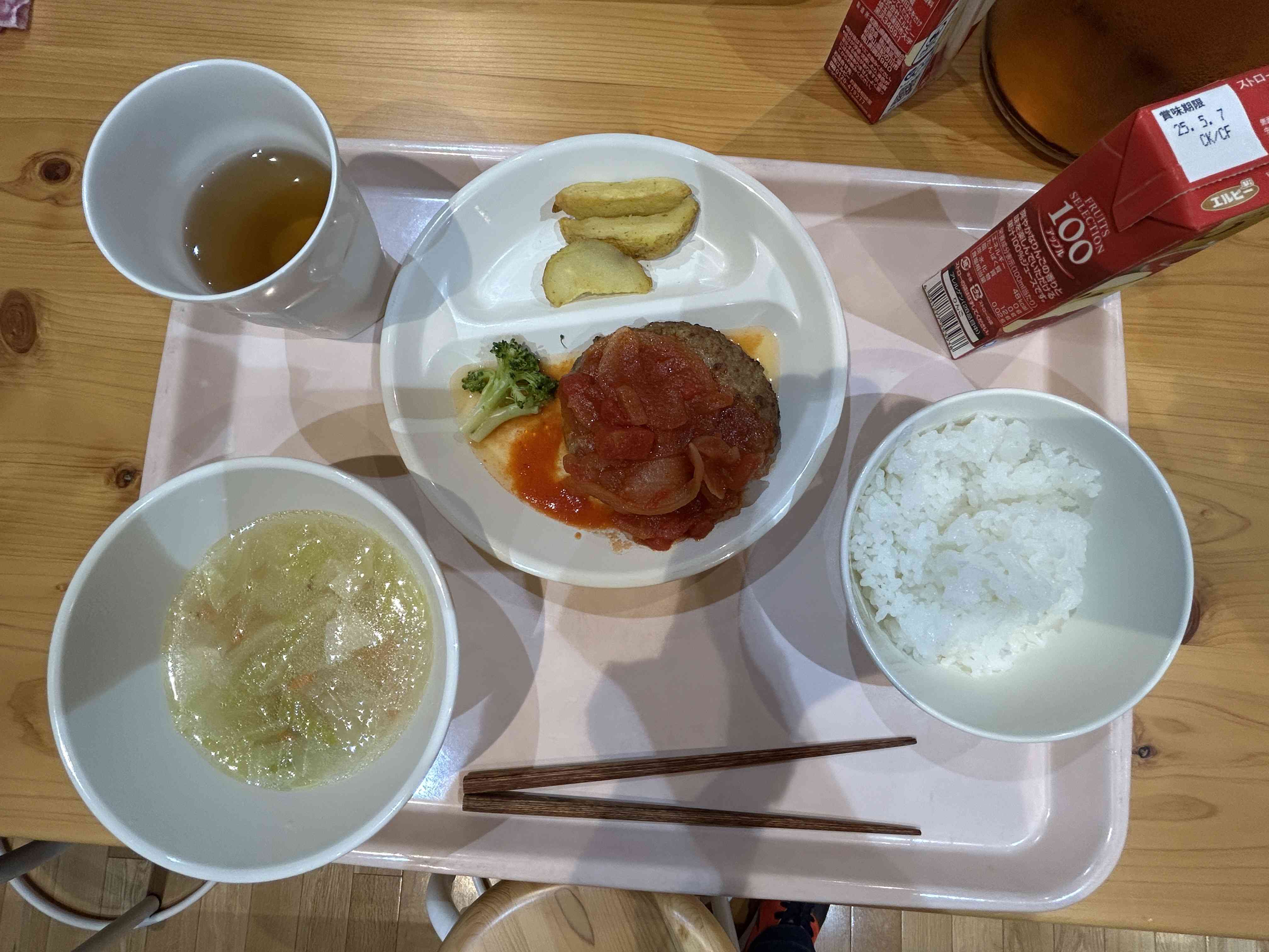 17時40分 夕食 食事係さんの頑張りで10分も早く始められました。 いただきますノマエニ拍手が贈られました。 がんばった食事係さんと今夜のメニューです。 ハンバーグがおいしかったです。ありがとうございます。