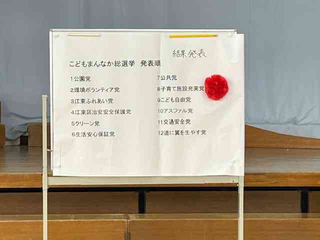 今回は、学校公開・土曜授業参観日に実施した、6年生こどもまんなか総選挙ですが、10/22(火)に結果発表が行われました。 選挙管理委員会による厳正なる集計作業の結果、以下のように決まりました。 第1位 子育て施設充実党 第2位 アスファル党 第3位 環境ボランティア党 という結果でした。 投票なので、勝敗や差が付いてしまいますが、どの党も、問題への喚起、解決策、予算立て、メリット・デメリット、デメリットへの対応などを資料に基づいた、素晴らしい演説&パフォーマンス&訴え力、そして質問力でした。SpeakUp素晴らしかったです。 写真は、1枚目、開票結果を待つこどもたち 2枚目、開票結果に一喜一憂するこどもたち 3枚目、1位に選ばれた子育て施設の充実を訴えて一番票を集め、インタビューを受ける子育て施設充実党のこどもたち 4枚目、1位に選ばれ当選マークを指さすこどもたち 最後5枚目は、投票結果掲示板。 6年生、どの「党」も本当によくがんばりました! 今日はこれから、その6年生のChallengeWednesday発表集会です。楽しみです。【添付ファイル】