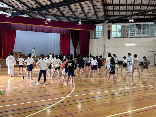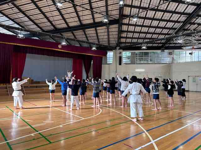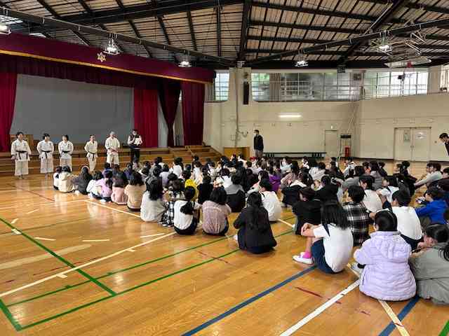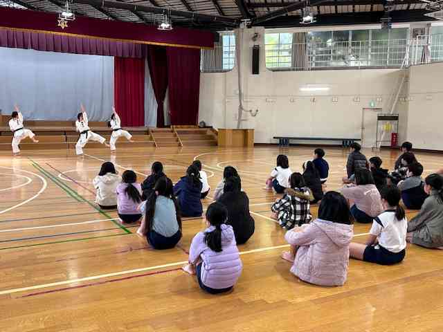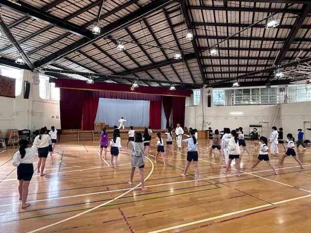 本校独自の取組、オリパラレガシー事業の一環としての5年生空手教室が開催されましたので紹介します。二辰小のお隣、日本空手道会館のご協力の下、毎年5年生が空手を教わっています。 今年は、11月19日(火)に行われました。最初に、全4クラスで全日本空手道連盟理事の有竹先生からの空手の歴史などを教わりました。 その後各クラス毎に、有竹先生のご指導の下、高橋事務局長、全日本女子団体の全日本チーム・強化選手の高倉選手、畑中選手、佐藤選手から、空手の基礎・基本を実地で教わりました。 指導の中盤、女子団体形の代表選手でもある3名による形のデモンストレーション、「燕飛」をご披露いただきました。素早く切れがあり力強くダイナミックな演舞を、どのクラスも息をするのも忘れるくらい食い入るように魅入っていました。そのため、その後の後半の練習、防御からの攻撃という一連の動きにも熱が入っていました。 しかも、今年は、講演+クラス指導+形演舞披露を4回繰り返し実施してくださいましたので、開催時刻が早く、選手の皆様はかなり早起きをして本校のためにご来校いただきました。指導の4回興業始め、さらに選手の皆様の礼儀や作法などの面からも学ぶべき事がたくさんありました。本当にありがとうございました。 毎年、地域学校支援本部の事業として仲介の労を執っていただいております、本校元PTA会長現顧問、そして現江東区青少年員 馬場さんにこの場を借りて御礼を申し上げます。 写真は、全体指導・講話、クラスごとの指導、代表選手により模範演技です。 お忙しい中、本当にありがとうございました。【添付ファイル】