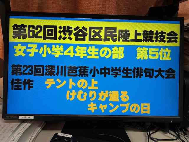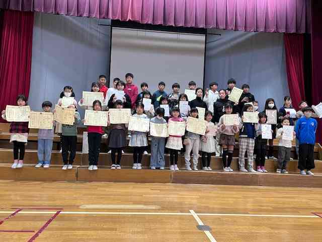 おはようございます。 以下、本日、表彰した大会等の続きを紹介します。本日だけでも、かなりの人数で、その2を本日すぐにアップします。 江東区小学校読書感想分コンクール、江東区おいしいメニューコンクール、はたらく消防写生会(2年生)、ヤマハエレクトーンフェスティバル、KONAMIスポーツクラブ水泳競技会東日本大会・体操競技大会京葉大会、第78回江東区民陸上大会小学校3年女子50m、港区サッカー大会、東京都スポーツ少年団大会空手選組み手・形、NBA横浜バレエコンクール、第62回渋谷区民陸上競技会、第23回深川芭蕉小中学生俳句大会、TOBIGERIONE JFA第48回全日本U-12サッカー選手権大会、第9回宮本慎也杯、江東スーパードッジボール有明大会です。 よくがんばりました。 最後に、記念写真を撮りました。 次は、25日(水)、冬休み前朝会の前半で紹介します。 今年も残すところあと1週間と少しです。今週も元気にがんばりましょう。【添付ファイル】