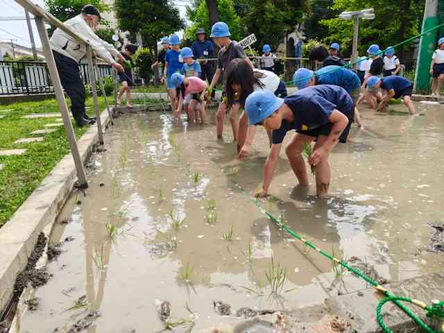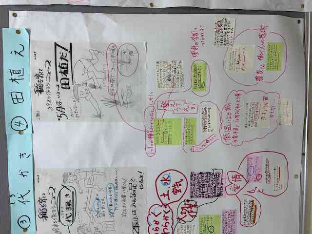 5年生総合的な学習の時間「つくってたべて考える コメ」。これまで、田起、代掻きの様子を紹介してきましたが、ついに、5/29(木)に田植えを行いました。 写真1枚目から3枚目。学校田を4等分して、各クラスごとに割り当て区画を植えました。植えた苗は、去年の5年生(現6年生)が暑さに強いコメとして調べてくれた「つや姫」他です。去年の総合の学習、「お米ウィーク」が引き継がれています。嬉しいですねぇ。 4枚目は、作業工程ごとに、5年生がクラスでまとめているものです。そこには、やったこと、感想や意見などが模造紙にまとめられています。今回の紹介はその「田植え」部分です。よい気付きやまとめをしていますね。 最後5枚目は、ほぼ毎週木曜日の朝の時間に始まったGIGAタイムの様子です。「とうきょうGIGAワークブック」を活用しています。今回は、1学年は、「パスワードの管理」について、誰にも教えないこと。5年生は「学習以外では使わないこと」などを確認していました。写真は3年生、「情報の伝え方」。今日の給食について伝える場面を例に学習している様子です。 今日はこの後、午後から、江東区連携教育の日で、辰巳中ブロックの開催です。今回は、辰巳中学校に、近隣の保幼小が集合して研修します。懐かしい卒業生の面々に会えるのが楽しみです。【添付ファイル】