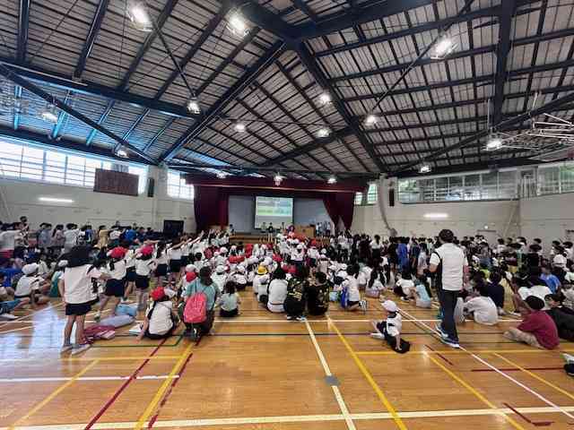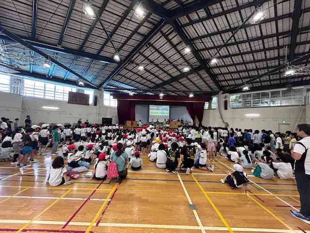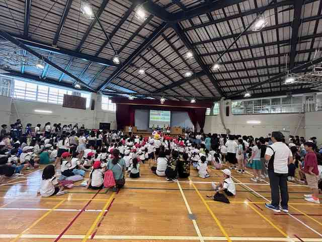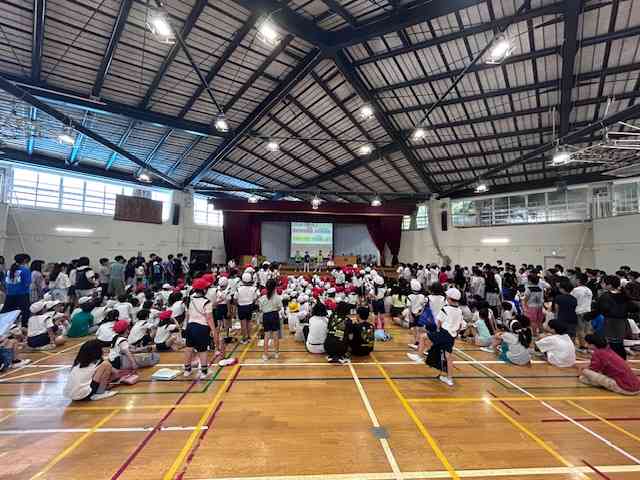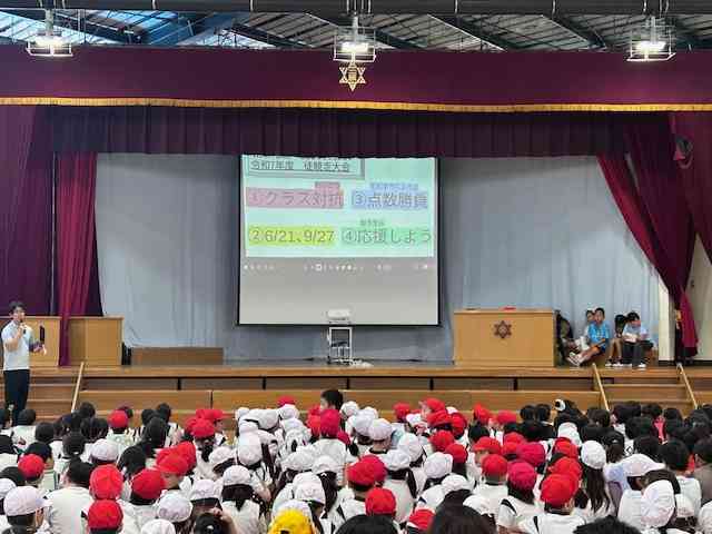学校公開初日です。ご来校・ご参観お待ちしております。 さて、今回は、17日(火)4年生のChallengeWednesday発表集会の後に実施しました「徒競走4色対抗決起集会」の様子を紹介します。 4色対抗徒競走大会については、運動会実施の際にもお話をしましたが、今年も運動会では、徒競走を行わず、学校公開の土曜授業参観にあたる日に実施する旨をお伝えしました。 昨年度、多くの保護者にご賛同をいただいたこの企画ですが、「盛り上がりに少し欠ける」「一生懸命に走っているのに点数は付かないの?」というお声をいただきました。それらの要望にもお応えするつもりで、「4色対抗徒競走大会」を企画しました。今年は、全学年が4クラスであること、2つの学年合同で応援し合うという趣向を取り入れました。着順を点数化して、最終的には、学校全体のチャンピオン組(色)を決定したいと考えています。 今回、本来ならば、4年生ChallengeWednesday発表集会の方を先に紹介すべきかと思いますが、明後日の土曜授業参観で、第1弾として4年生&6年生の徒競走が実施されます。 そのため、より盛り上がっていくために、体育部&体育委員会が今回の「徒競走4色対抗決起集会」を計画しました。そのときの様子を先に紹介させてください。 どのクラスも、「◯くみぃ~、ぐぁんばるぞぉー!」「うぉー」という声の掛け合い&気合いの確かめ合いを4色とも行いました。 いやぁ~、どの色(クラス)も盛り上がりました!明後日が一段と楽しみになりました。 写真は、今回の徒競走のやり方、そして、各4色代表によるシュプレヒコール!と応える仲間たちです。 今日から3日間の第1回学校公開、ご来校お待ちしています。正門から入っていただき、必ず受付をお通りいただきますように、ご理解・ご協力いただければと思います。 期間中、各学年、学年の発達段階に合わせた内容のセーフティ教室を実施しています。是非、お子様と一緒にご覧いただき、おうちに帰って、お子様と話し合っていただけるようにと設定している授業です。どうぞよろしくお願いします。【添付ファイル】
