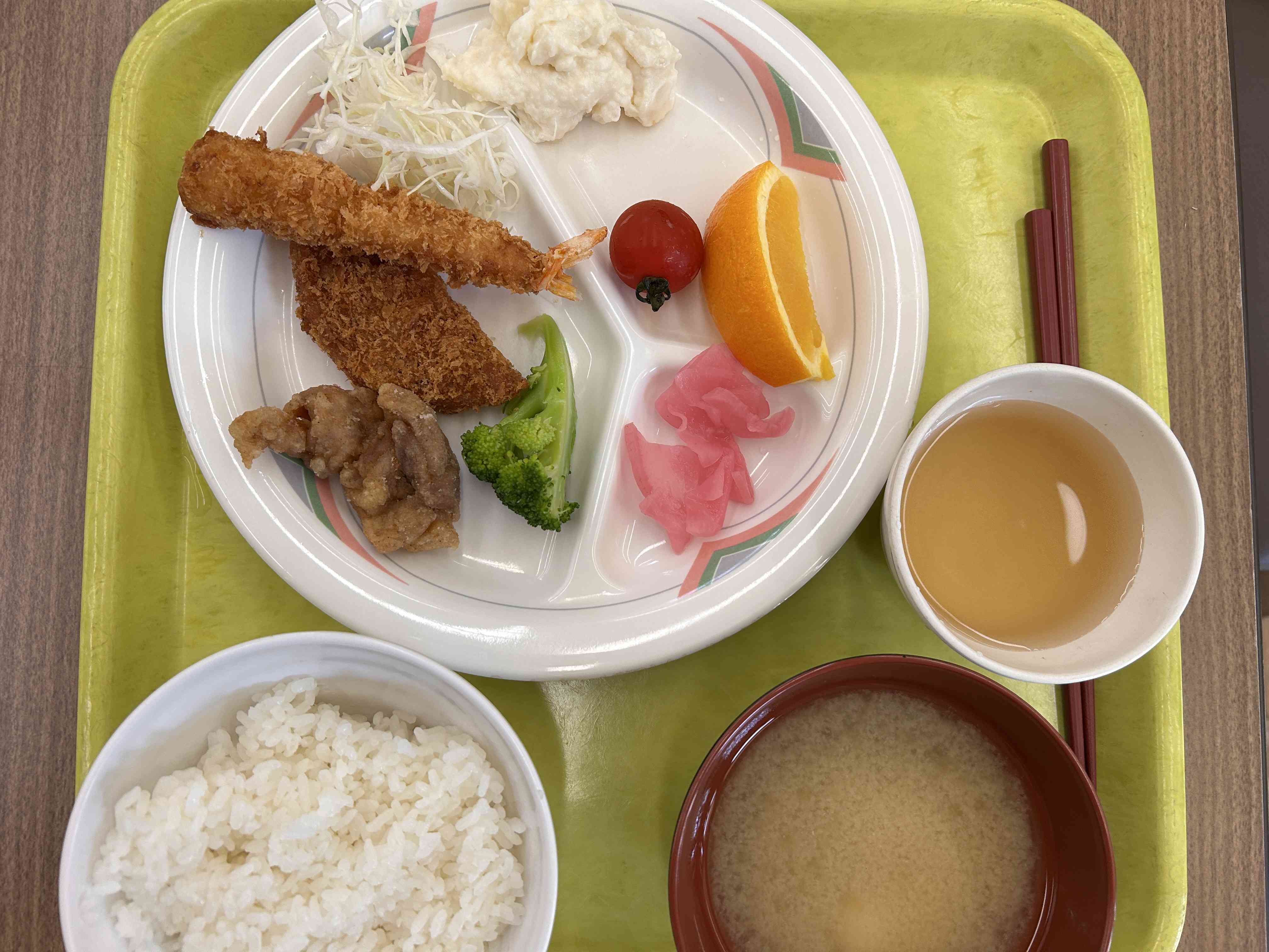 昼食 第一陣 メニュー 少し茶色系ですが こどもたちには大人気! お米と味噌汁が絶妙です。