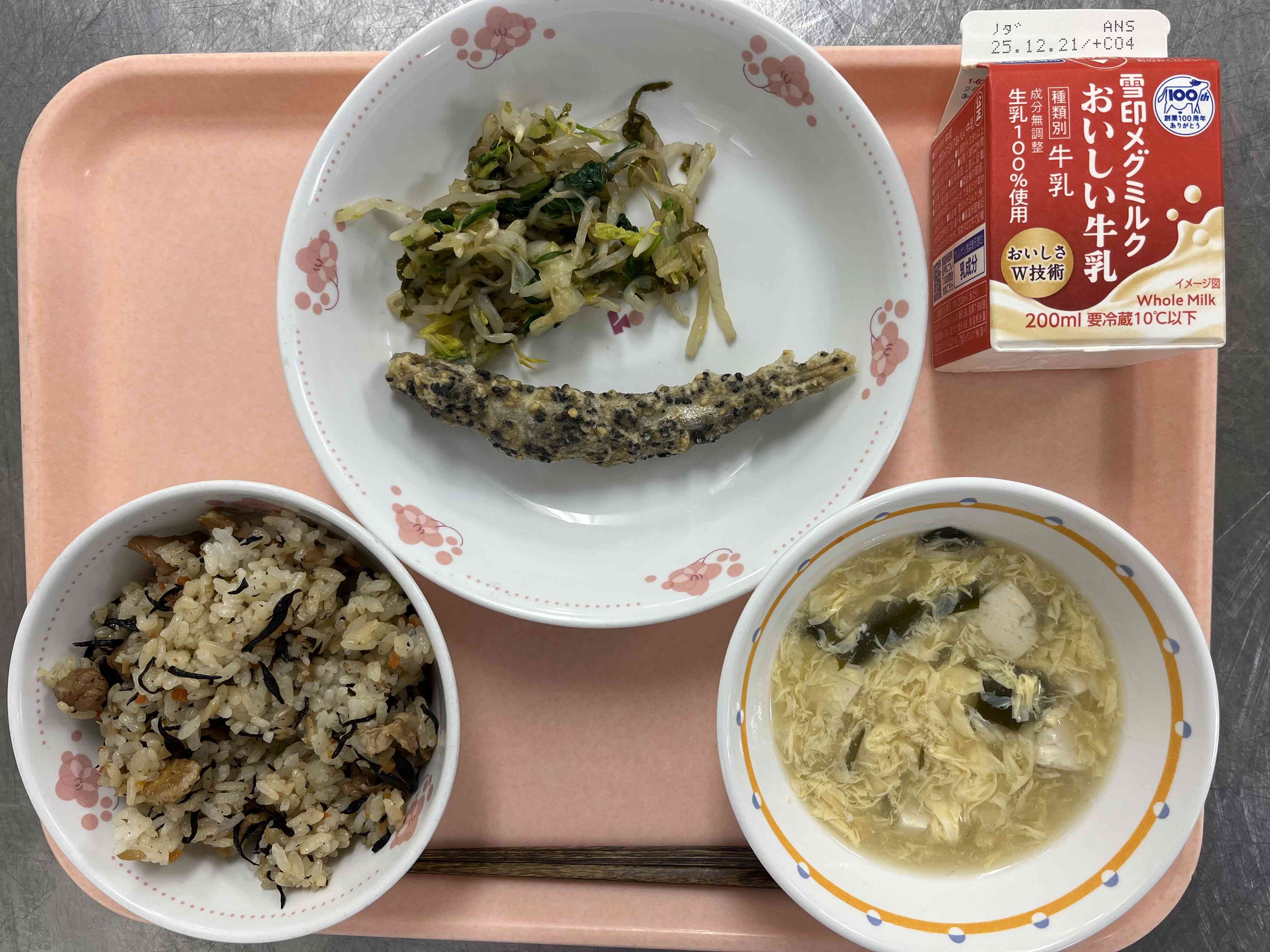 ○牛乳 ○ひじきいり五目ごはん ○ししゃもの石垣あげ ○いそか和え ○かきたま汁