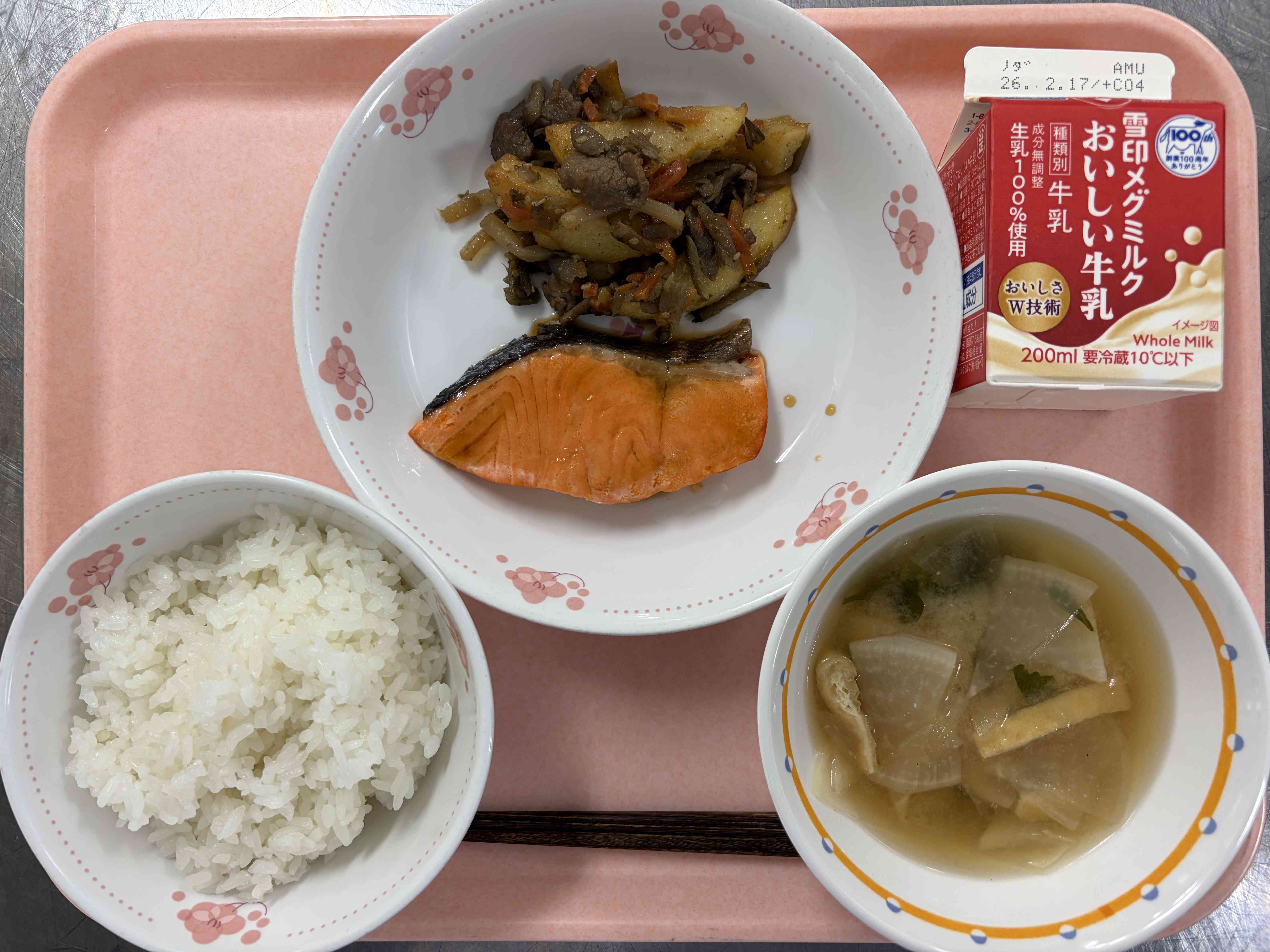 〇牛乳 〇ごはん 〇鮭の照り焼き 〇じゃがいものきんぴら炒め 〇みそ汁