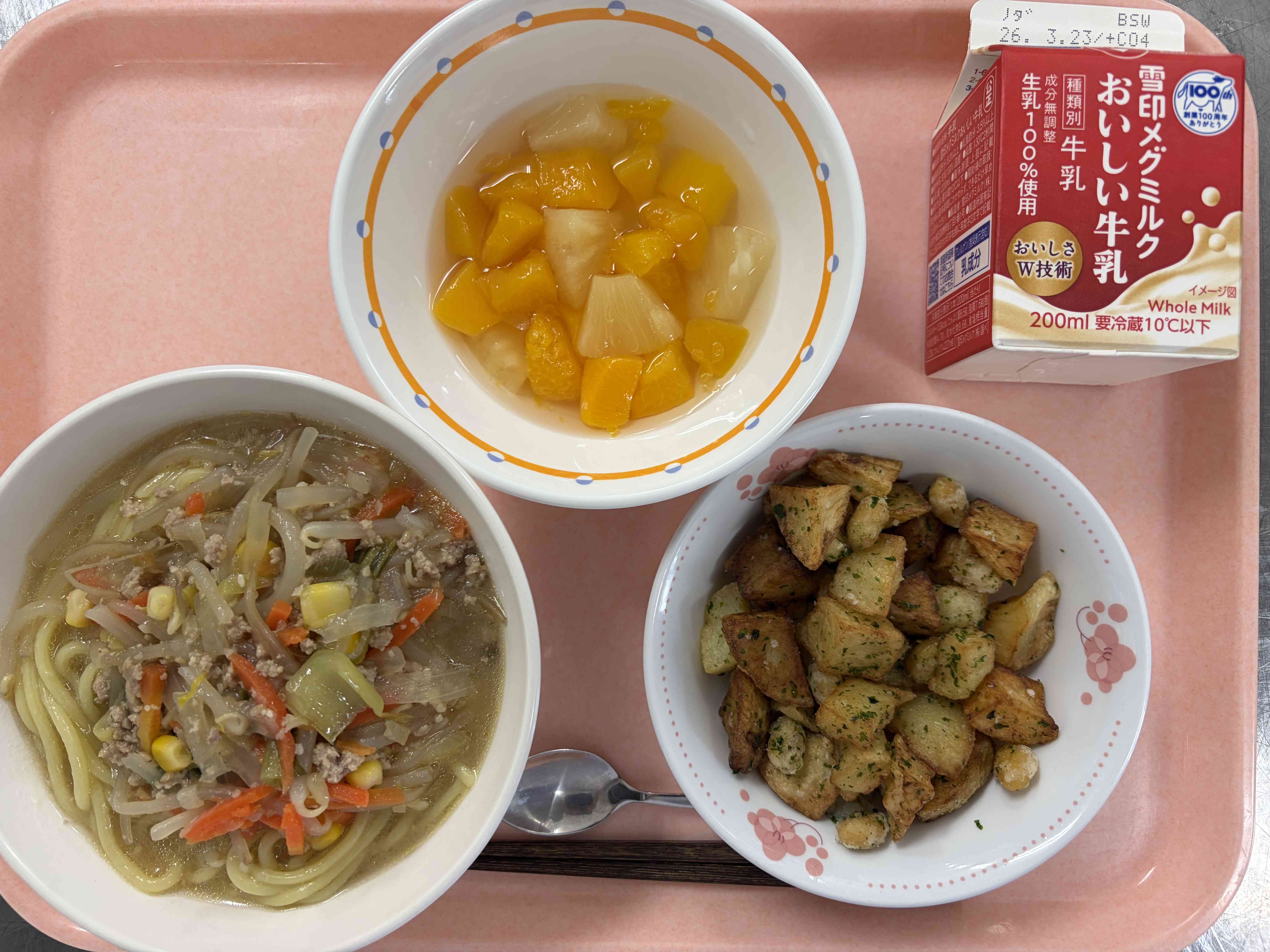 〇牛乳 〇みそラーメン 〇青のりビーンズポテト 〇フルーツポンチ