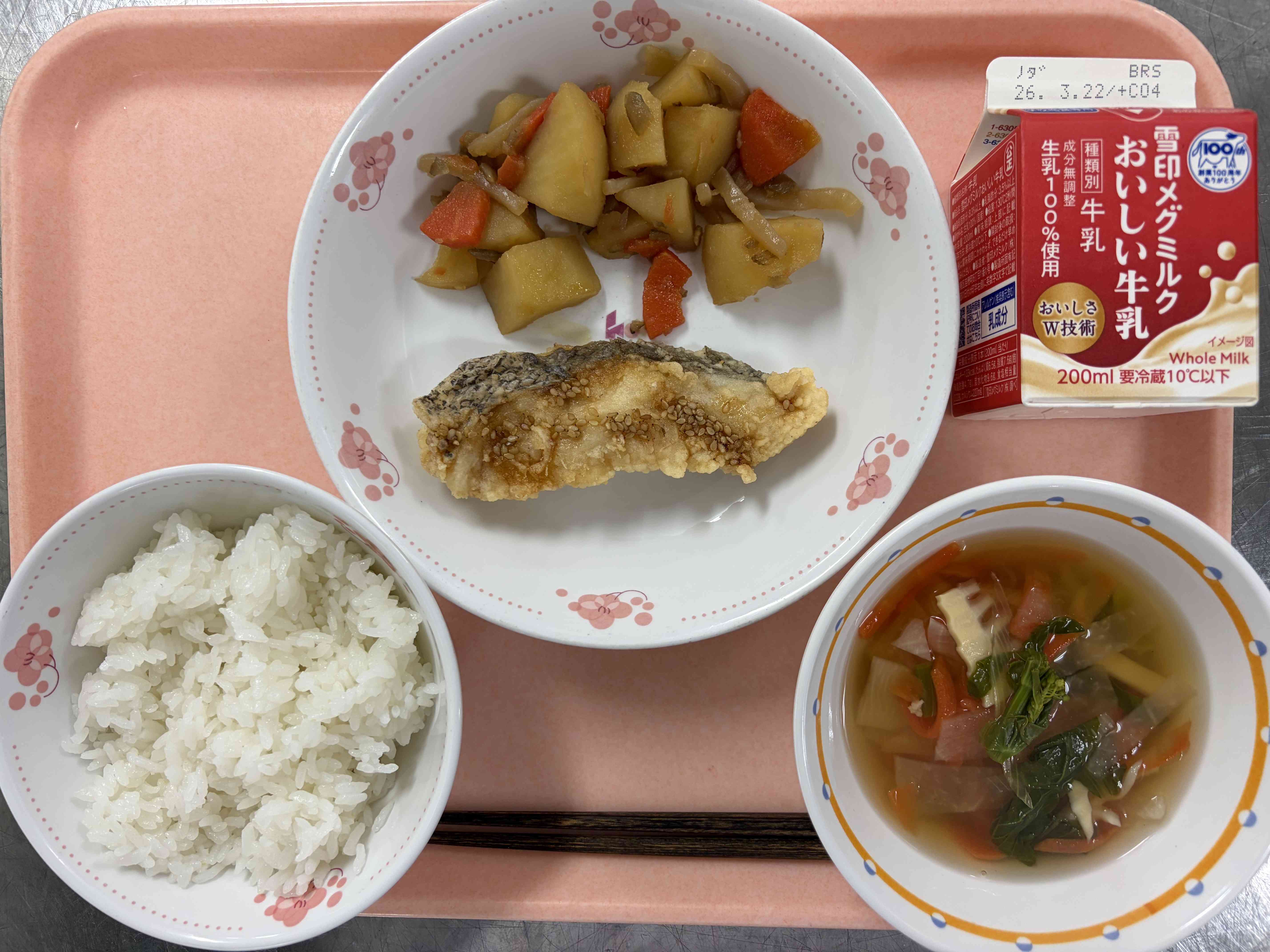 〇牛乳 〇ごはん 〇白身魚のあずま煮 〇こんにゃくとじゃがいものピリから煮 〇春野菜のすまし汁